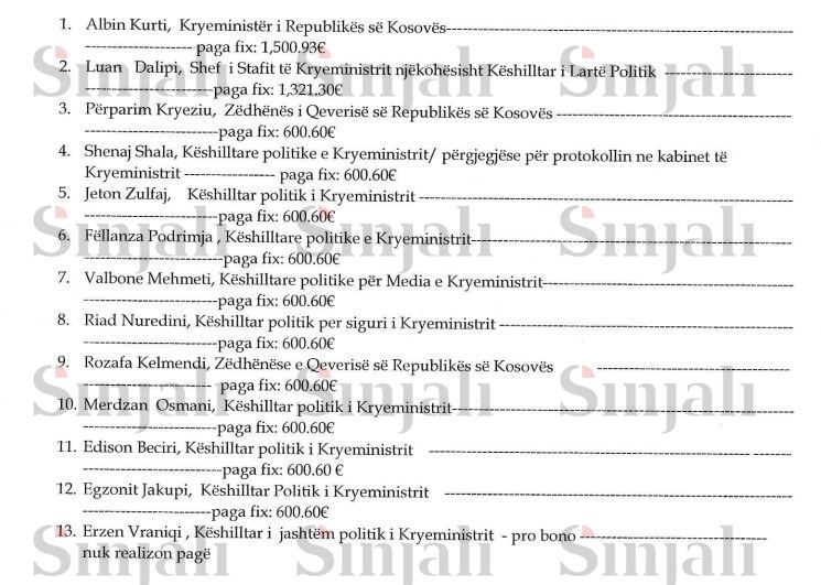 Zëdhënësi i Qeverisë, Përparim Kryeziu merr 600 euro. Po këtë pagë e marrin edhe nëntë këshilltarët e tij, përveç Erzen Vraniqit, i cili nuk merr pagë.