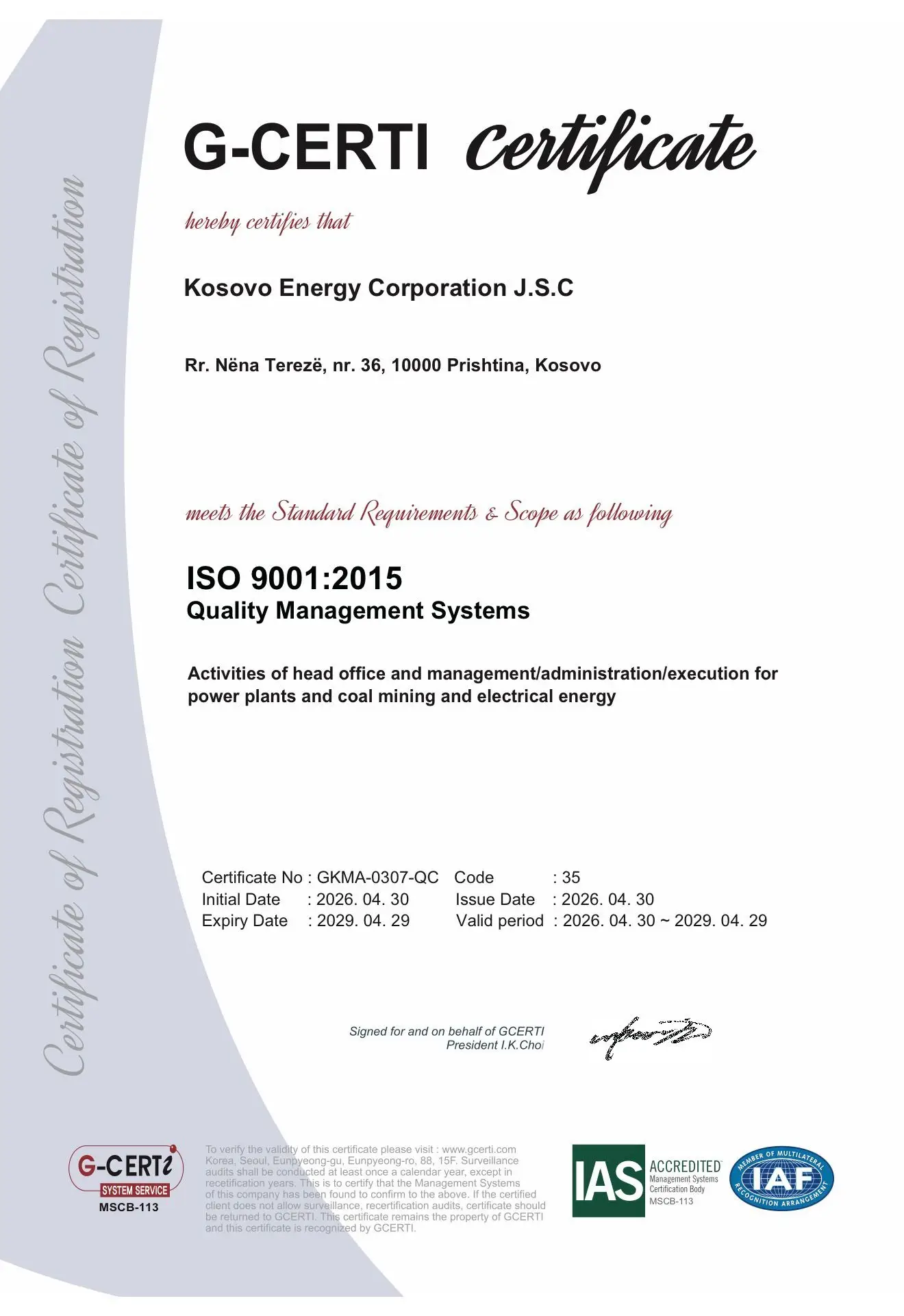 Korporata Energjetike e Kosovës (KEK) ka arritur një tjetër sukses në procesin e modernizimit, duke u certifikuar me standardin ndërkombëtar ISO 9001:2015 për Menaxhimin e Cilësisë.