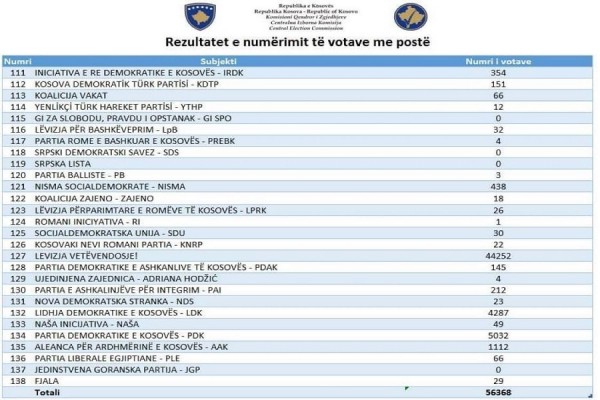 Nga numërimi i 56 mijë e 368 votave nga diaspora, Lista Serbe, GI SPO, SDS dhe JGP nuk kanë marrë asnjë votë.