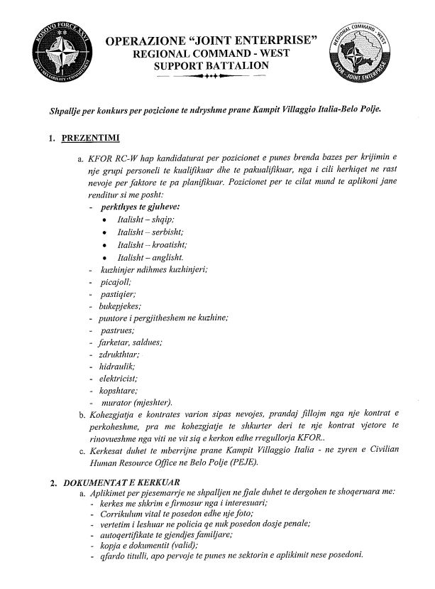 KFOR-i me bazë në Villaggio Italia, afër Pejës ka hapur konkurs për pozita të ndryshme.