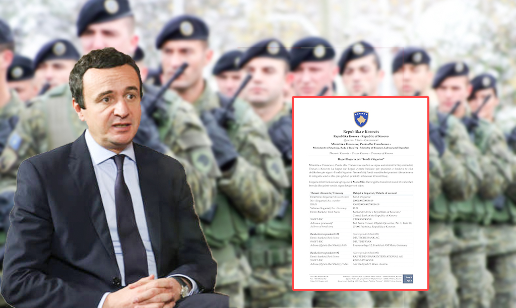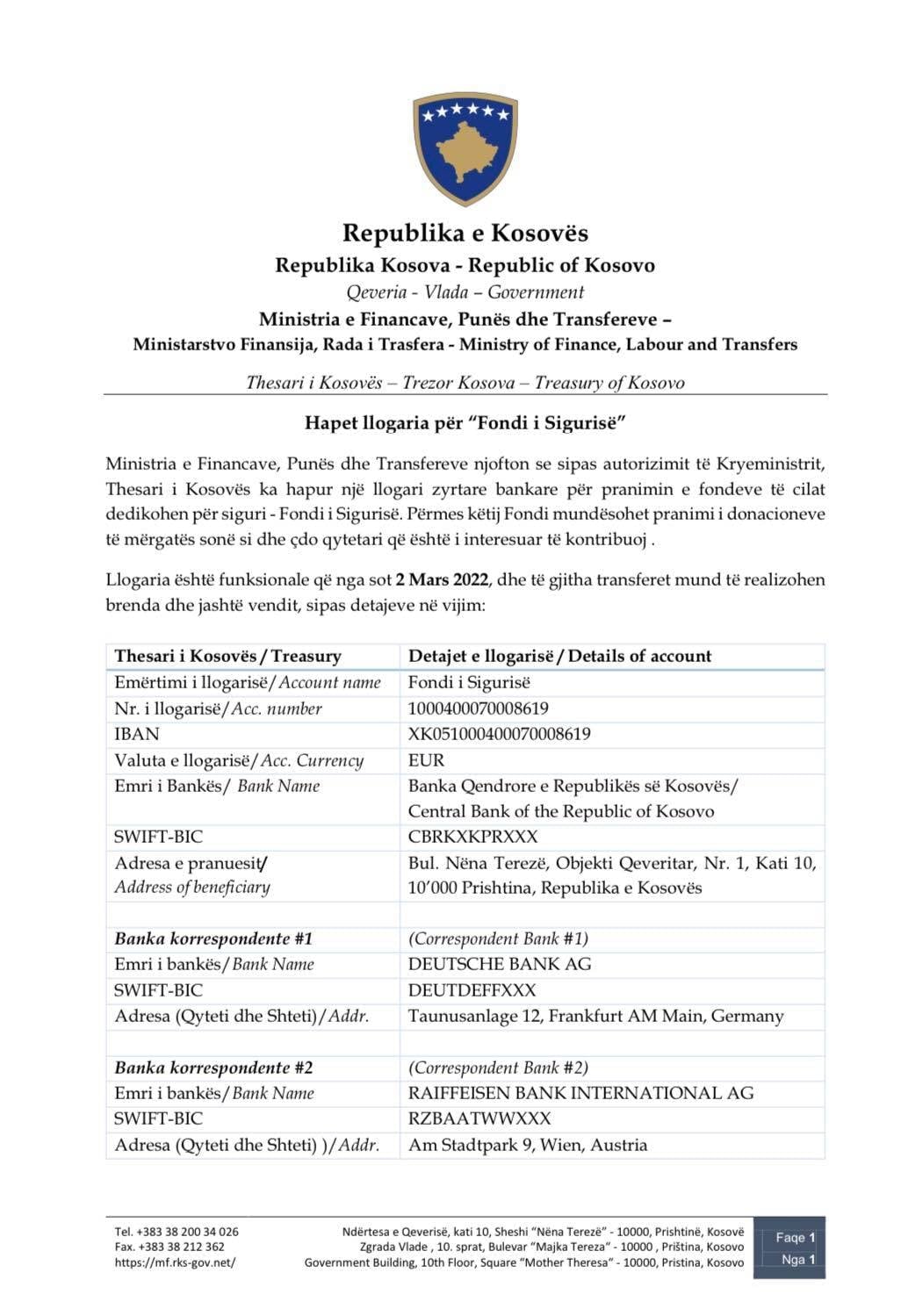 U hap llogaria zyrtare bankare për Fondin e Sigurisë.