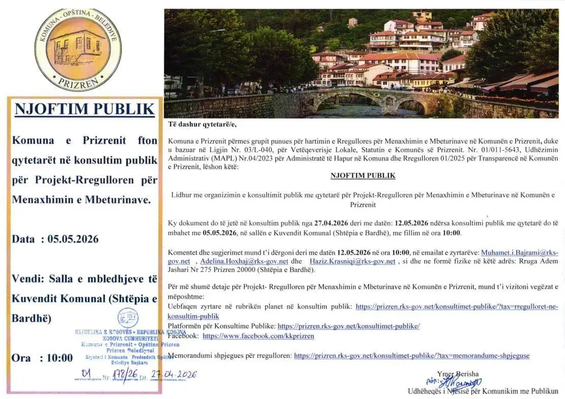 Komuna e Prizrenit ka ftuar qytetarët të marrin pjesë në konsultimin publik për “Projekt-Rregulloren për Menaxhimin e Mbeturinave në Komunën e Prizrenit”, ku mund të dhurojnë komentet dhe sugjerimet e tyre lidhur me këtë çështje.