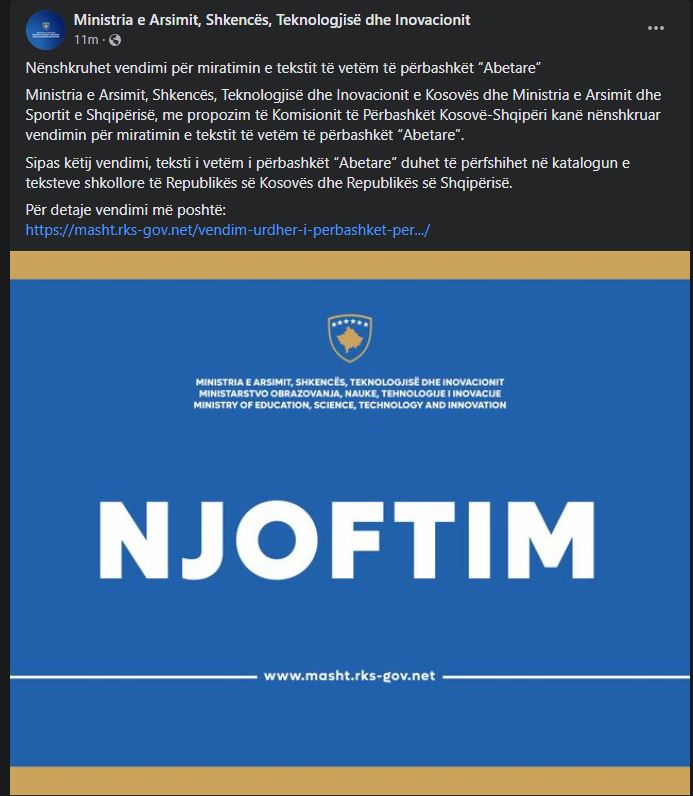 “Ministria e Arsimit, Shkencës, Teknologjisë dhe Inovacionit e Kosovës dhe Ministria e Arsimit dhe Sportit e Shqipërisë, me propozim të Komisionit të Përbashkët Kosovë-Shqipëri kanë nënshkruar vendimin për miratimin e tekstit të vetëm të përbashkët “Abetare”, thuhet në njoftimin e MAShT-it.