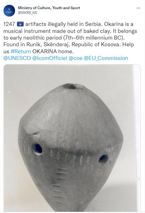 “1247 artefakte të Kosovës mbahen ilegalisht në Serbi. Okarina është një instrument muzikor i bërë nga balta e pjekur. I përket periudhës së neolitit të hershëm (mijëvjeçari VII–VI p.e.s.). Gjetur në Runik, Skënderaj, Republika e Kosovës. Na ndihmoni #Kthejeni i OKARINA në shtëpi”, thuhet në njoftimin e MKRS-së.