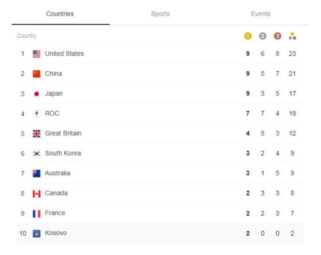 Momentalisht prijnë Shtetet e Bashkuara të Amerikës me nëntë të arta, pesë të argjendta dhe tetë të bronzta, e ndjekur nga Kina dhe Japonia që kanë gjithashtu nga nëntë medalje të arta.