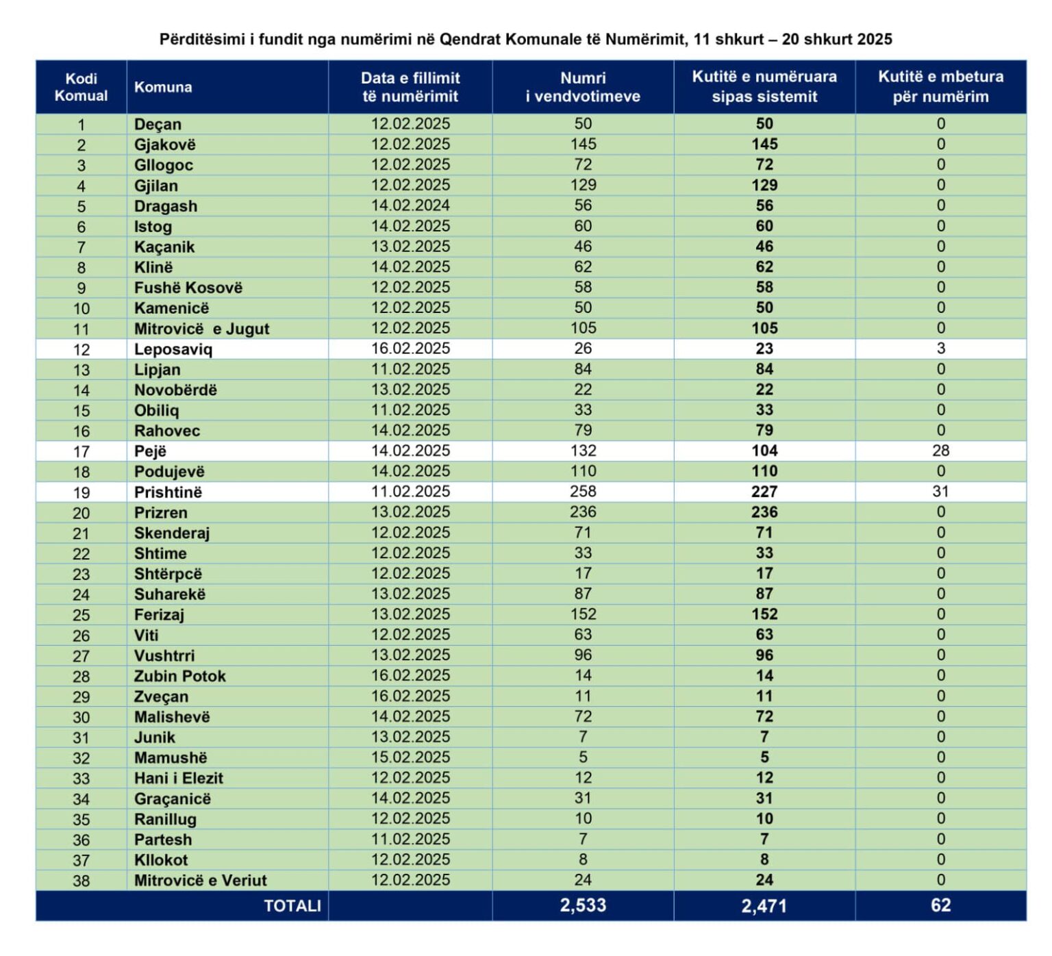 Sipas të dhënave të pranuara nga qendrat komunale të numërimit, në të cilat është duke vazhduar apo ka përfunduar procesi i numërimit të votave të kandidatëve për deputetë nga Zgjedhjet për Kuvendin e Kosovës.