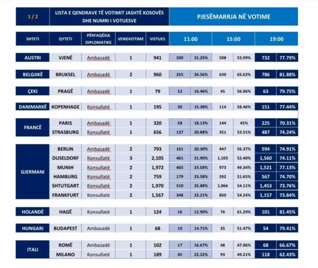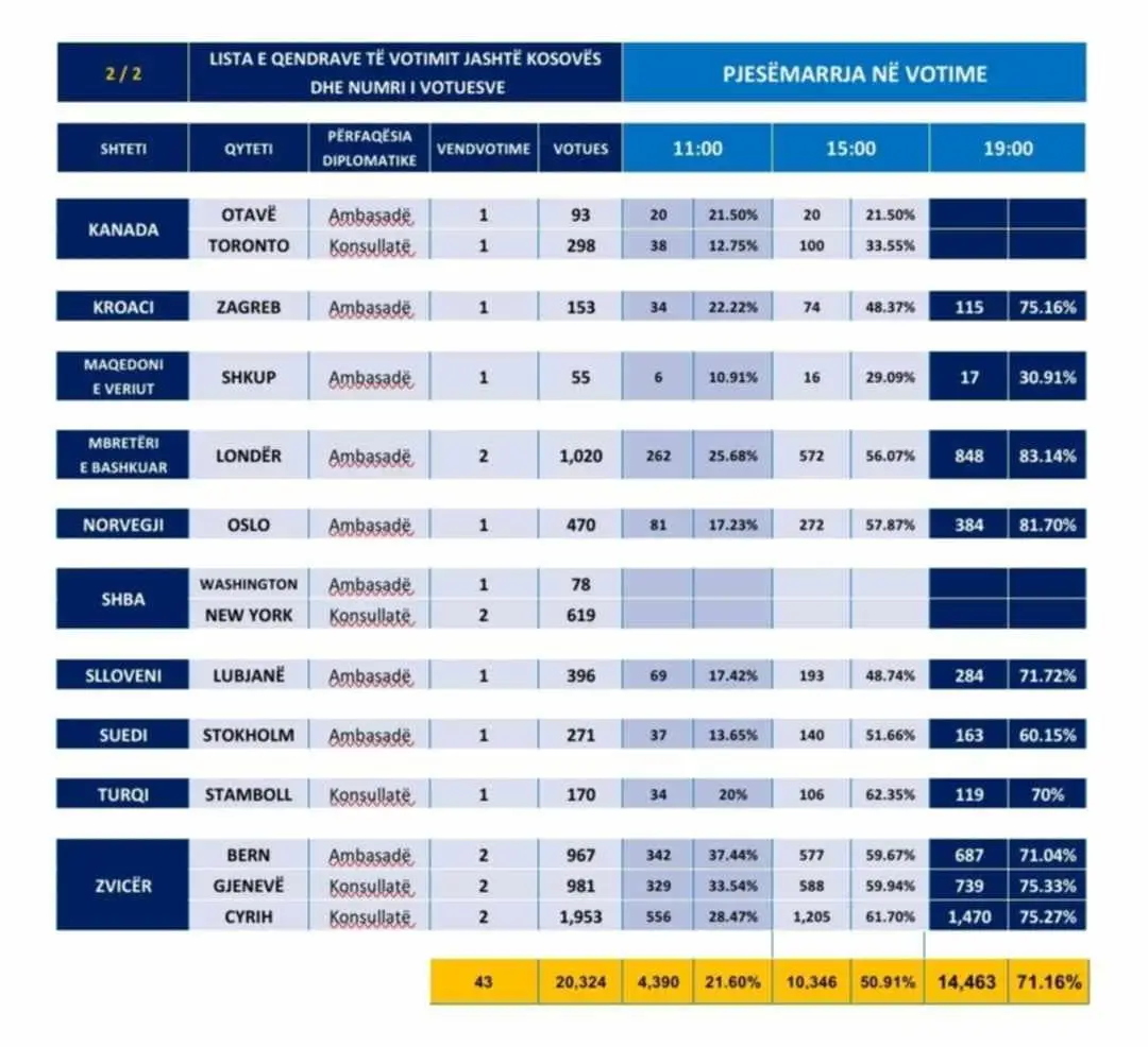“Ju njoftojmë se deri në orën 19:20 sipas orës lokale në vendin tonë, ka përfunduar votimi për përfaqësitë në 26 përfaqësi diplomatike, të cilat janë të vendosura në 17 shtete të ndryshme. Procesi i votimit është duke vazhduar në 4 përfaqësi të tjera të vendosura në SHBA dhe Kanada dhe pritet të përfundojë në orën 1 pas mesnate sipas orës sonë lokale”, ka thënë ai.