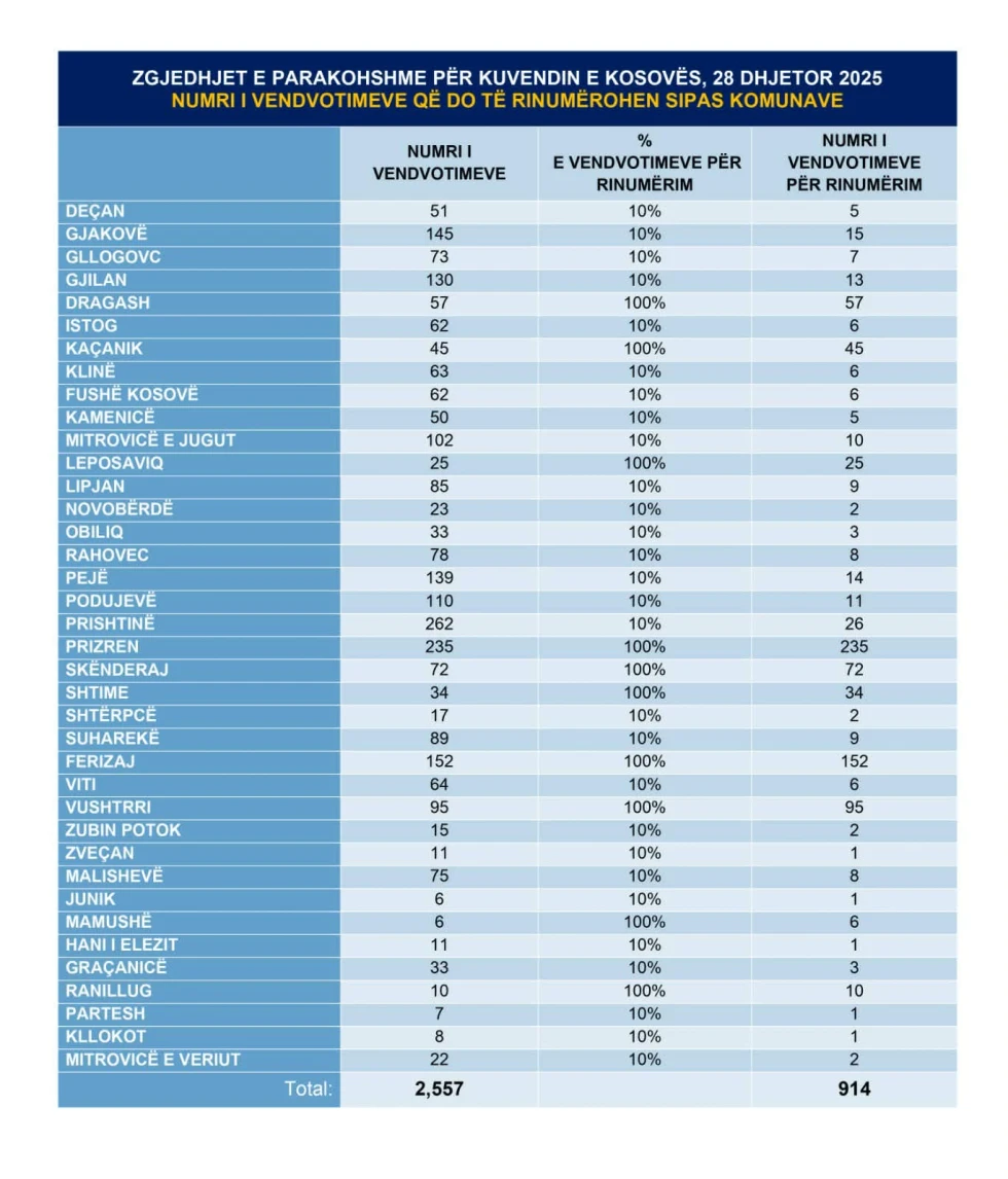 Komisioni Qendror i Zgjedhjeve (KQZ) të martën ka vendosur që të rinumërohen gjithsej 914 vendvotime nga zgjedhjet e 28 dhjetorit. Në 10 komuna, votat do të rinumërohen në tërësi, ndërsa në 28 komuna do të rinumërohen 10 për qind e vendvotimeve. Rinumërimi do të nisë sot.