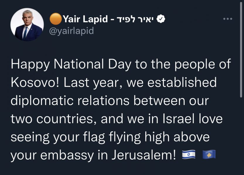 “Gëzuar Ditën Kombëtare popullit të Kosovës! Vitin e kaluar, ne vendosëm marrëdhënie diplomatike midis dy vendeve tona dhe ne në Izrael na pëlqen ta shohim flamurin tuaj duke u valëvitur lart mbi ambasadën tuaj në Jerusalem! 🇮🇱 🇽🇰”, ka shkruar Lapid në Twitter.