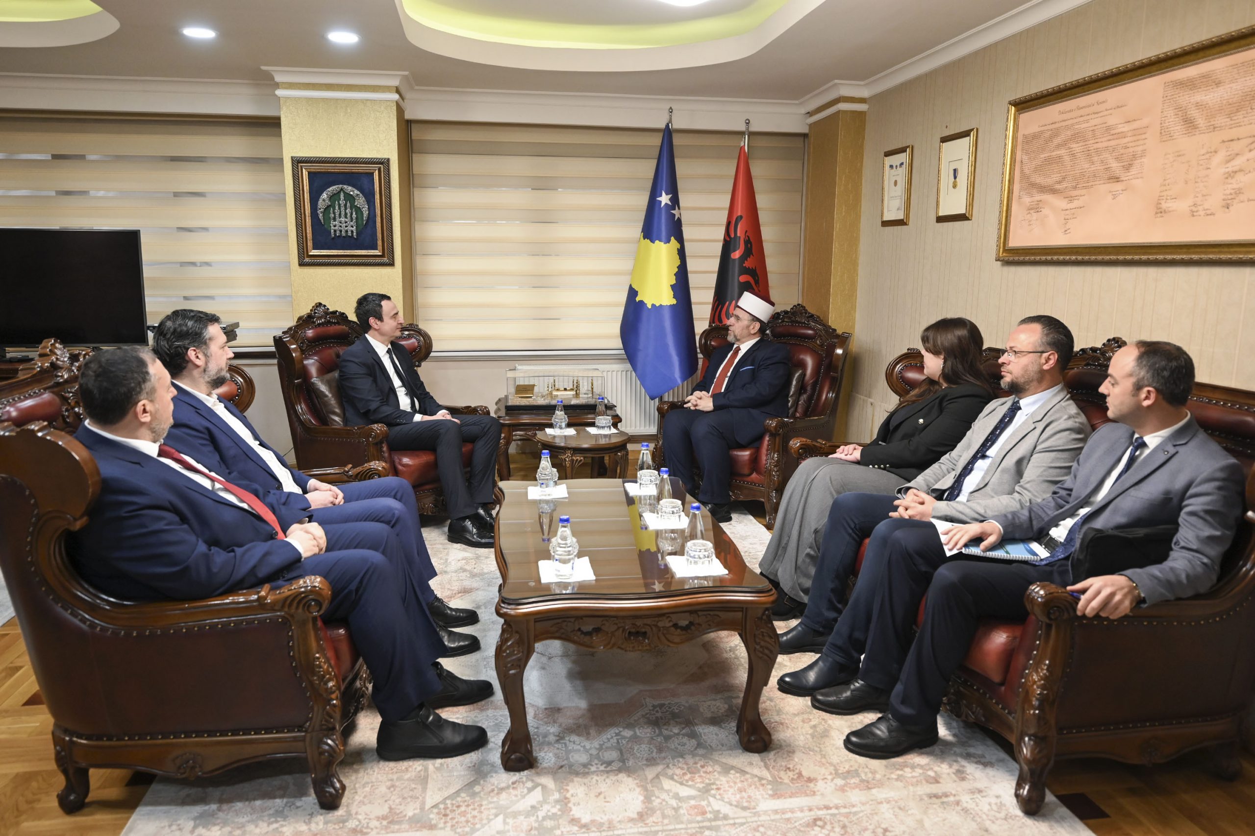 Kryeministri i Kosovës Albin Kurti, u prit në takim nga kryetari i Bashkësisë Islame të Kosovës, Myftiu Naim Tërnava.