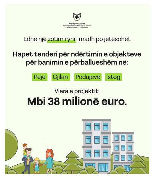 Kryeministri i Kosovës, Albin Kurti, ka theksuar angazhimin e Qeverisë për të bërë Kosovën më të jetueshme për të gjithë qytetarët. Ai ka njoftuar se sot ka nisur tenderi për ndërtimin e objekteve për banim të përballueshëm, një nismë që do të sigurojë banesa të përballueshme dhe të dinjitetshme për qytetarët e Kosovës.
