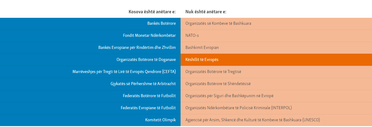 Kosova të enjten ka aplikuar për anëtarësim në Këshillin e Evropës. Deri tash ajo është bërë anëtare e disa organizatave ndërkombëtare, përfshirë edhe ato më të rëndësishme financiare dhe sportive.