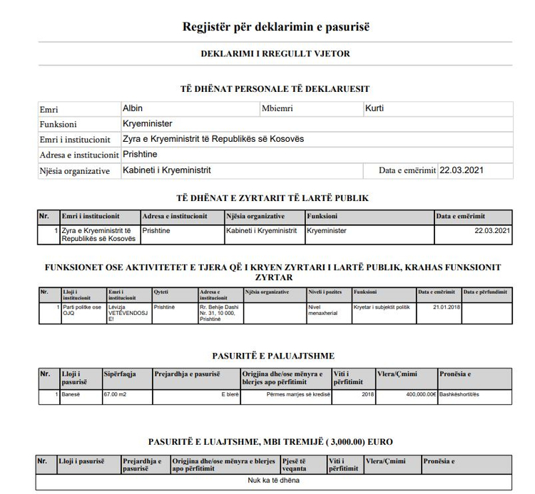 Kurti nuk ka deklaruar ndonjë pasuri të paluajtshme apo të luajtshme në emër të tij.
