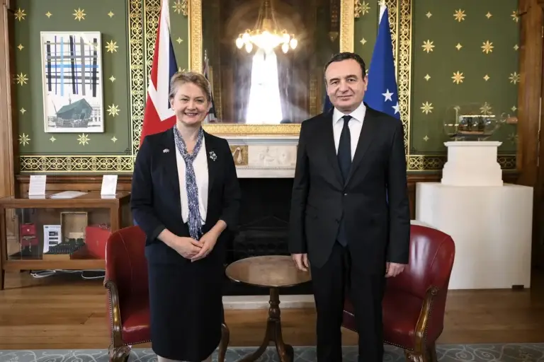 Pak para fillimit të punimeve të Samitit të Procesit të Berlinit, i cili po mbahet në Londër, kryeministri në detyrë i Republikës së Kosovës, Albin Kurti, u mirëprit në takim nga sekretarja e Shtetit për Punë të Jashtme të Mbretërisë së Bashkuar, Yvette Cooper.