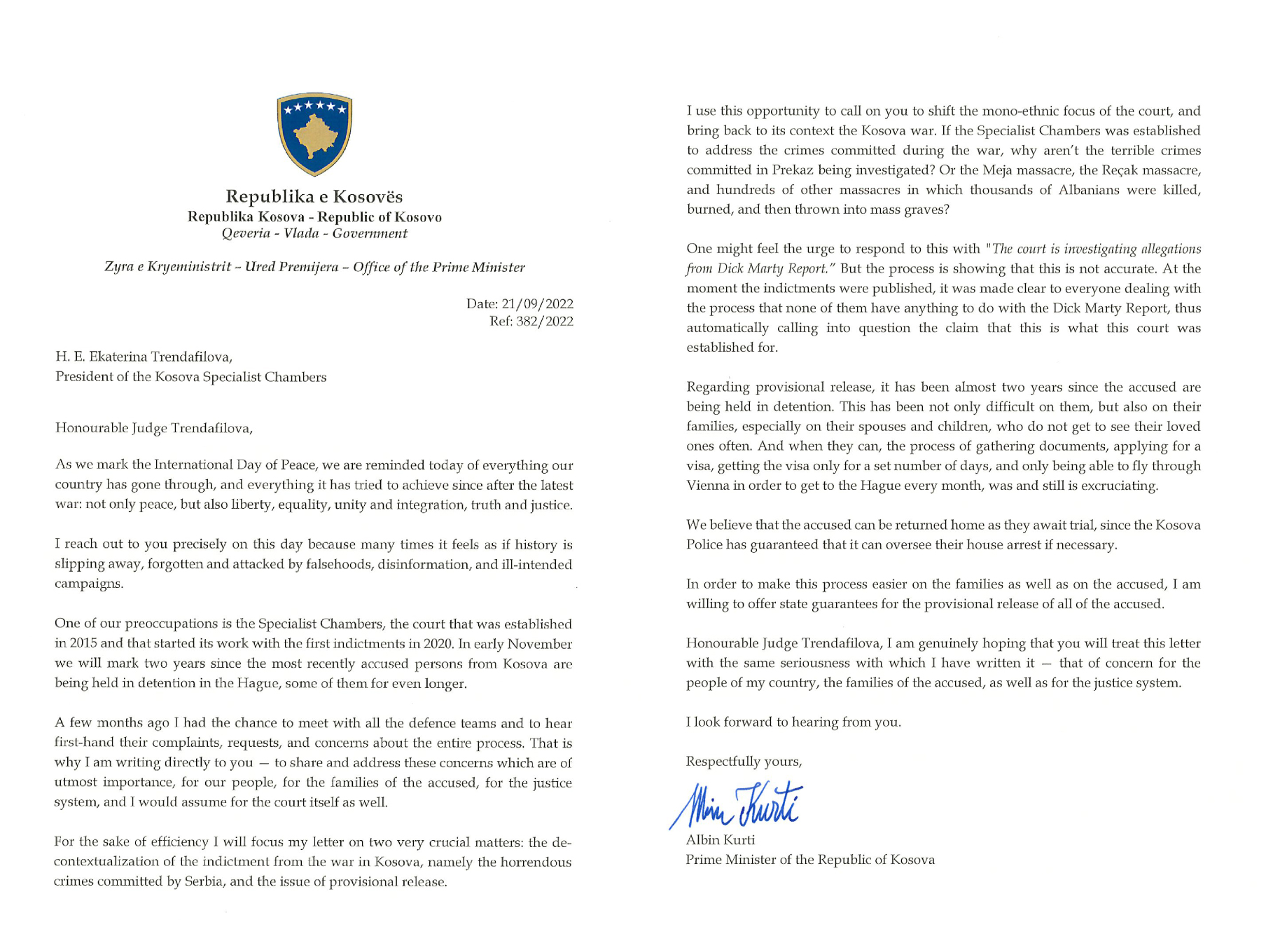 Më poshtë mund të gjeni të bashkëngjitur letrën e plotë të kryeministrit në detyrë, Albin Kurti, drejtuar kryetares së Dhomave të Specializuara të Kosovës, gjyqtares Ekaterina Trendafilova: