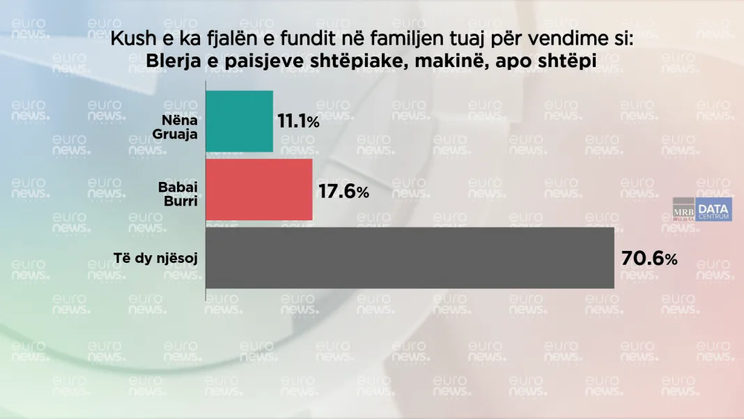 Në familjet shqiptare vendimet me më shumë peshë i marrin burrat. Sipas sondazhit të bërë nga Barometri në Euronews Albania, 17.6% e të pyeturve mendojnë se vendimin për blerjen e pajisjeve shtëpiake, makinës apo shtëpisë e marrin burrat.