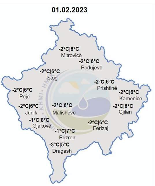 Temperaturat minimale do të lëvizin nga -3 deri -3 më e ulëta, ndërsa ato maksimale prej 5 deri në 7 gradë Celsius.