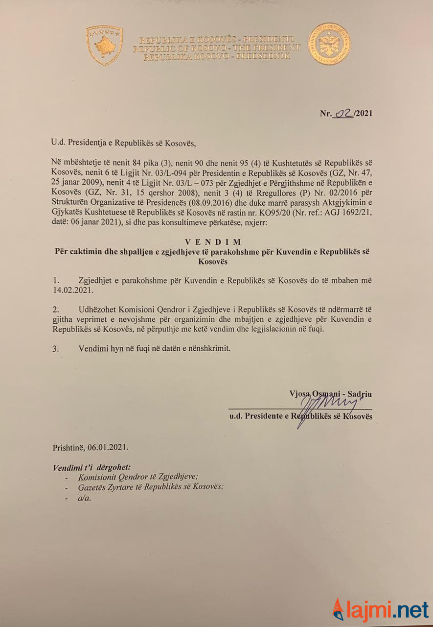 “Duke u bazuar në përgjegjësitë kushtetuese dhe Aktgjykimin e Gjykatës Kushtetuese Nr. KO-95/20, si dhe pas diskutimit me partitë parlamentare dhe Komisionin Qendror të Zgjedhjeve, u.d. Presidentja, Vjosa Osmani, ka marrë vendim të shpallë zgjedhjet dhe të caktojë 14 shkurtin 2021 datë për mbajtjen e zgjedhjeve parlamentare të parakohshme”, thuhet në njoftim.