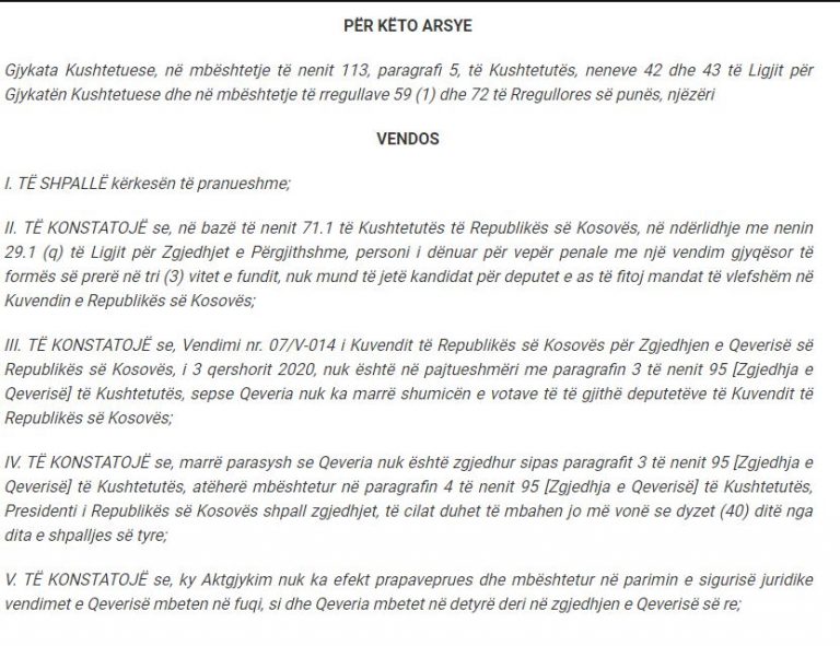 TË KONSTATOJË se, në bazë të nenit 71.1 të Kushtetutës të Republikës së Kosovës, në ndërlidhje me nenin 29.1 (q) të Ligjit për Zgjedhjet e Përgjithshme, personi i dënuar për vepër penale me një vendim gjyqësor të formës së prerë në tri (3) vitet e fundit, nuk mund të jetë kandidat për deputet e as të fitoj mandat të vlefshëm në Kuvendin e Republikës së Kosovës;