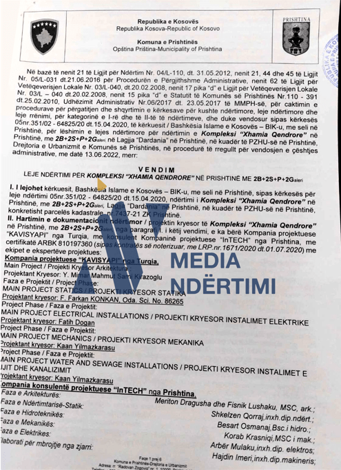Kjo kërkesë tashmë është miratuar nga Drejtoria e Urbanizmit të Komunës së Prishtinës ku më datë 13 qershor 2022, ka marrë vendim për ta lëshuar lejen e ndërtimit për Kompleksin “Xhamia Qendrore” në Prishtinë.