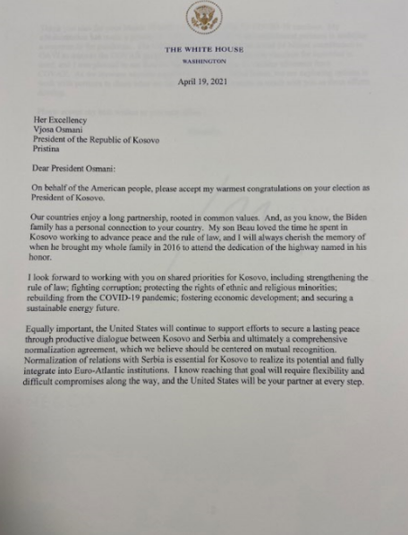 Presidenti amerikan Joe Biden i ka dërguar letër urimi me rastin e zgjedhjes në postin e presidentes, Vjosa Osmanit.Letra mban datën 19 prill 2021 e nënshkruar nga presidenti Biden ku theksohet se administrata e Biden do të punojë me presidenten Osmani në prioritetet e shumta e sidomos me ndihmën për sigurimin e vaksinave.