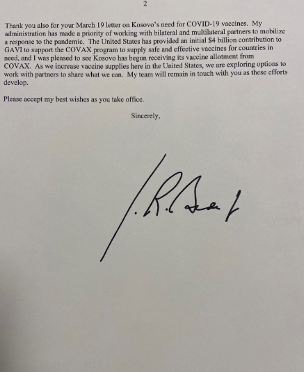 “Presidenti Biden ka theksuar se do të punojë me Presidenten Osmani në prioritetet që kanë të bëjnë me forcimin e sundimit të ligjit, luftën kundër korrupsionit, mbrojtjen e të drejtave të pakicave dhe bashkësive fetare, rimëkëmbjen nga pasojat e pandemisë Covid-19, zhvillimin ekonomik si dhe sigurimin e të ardhmes së qëndrueshme energjetike. Presidenti Biden i është përgjigjur edhe kërkesës së Presidentes Osmani që SHBA-të të ndihmojnë me vaksina, bazuar në letrën e saj të 19 marsit. Presidenti Biden ka potencuar se me shtimin e sasisë së vaksinave, SHBA-të do të punojnë me partnerët për shpërndarjen e tyre dhe se ekipi i tij do të jetë ne kontakt me Presidenten Osmani për realizimin e synimit të tillë”, thuhet në letër.
