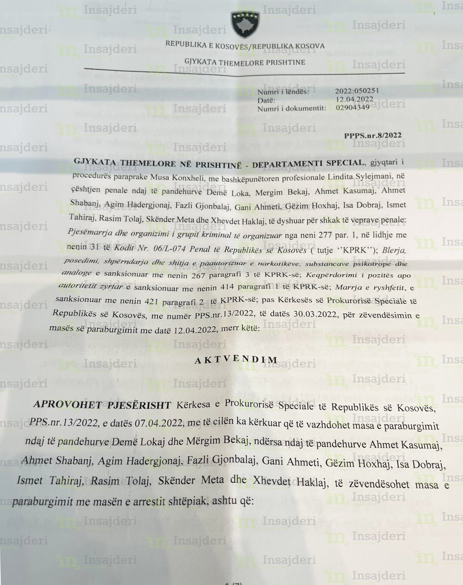 Bazuar në kërkesën e siguruar nga Insajderi mësohet se dy zyrtarëve policorë të cilëve iu është vazhduar masa e paraburgimit janë Demë Lokaj dhe Mërgim Bekaj, teksa, ua ka zëvendësuar masën e paraburgimit me atë shtëpiak të pandehurve Ahmet Kasumaj, Ahmet Shabanj, Agim Hadergjonaj, Fazli Gjonbalaj, Gani Ahmeti, Gëzim Hoxhaj, Isa Dobraj, Ismet Tahiraj, Rasim Tolaj, Skënder Meta dhe Xhevdet Haklaj.