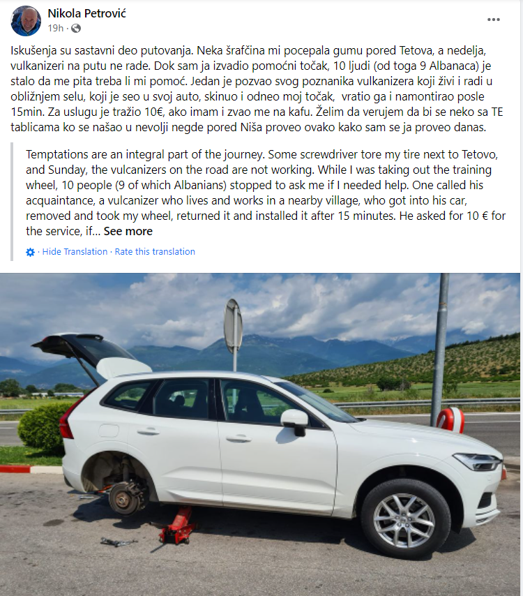 “Tundimet janë një pjesë e udhëtimit. Diçka ma shpërtheu gomën pranë Tetovës dhe të dielën vullkanizatorët në rrugë nuk punojnë. Pasi e nxora rrotën ndihmëse, 10 persona (9 prej tyre shqiptarë) u ndalën për të më pyetur nëse kisha nevojë për ndihmë“, ka shkruar Petroviç