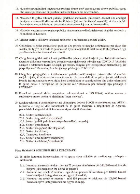 Sipas vendimit, ndalohen të gjitha tubimet publike, përfshirë seminaret, punëtoritë, dasmat dhe ahengjet familjare, ceremonitë dhe veprimtarit fetare (përveç familjes së ngushtë) si dhe çfarëdo formë tjetër e organizimit më përjashtim të rasteve të lejuara me këtë vendim.