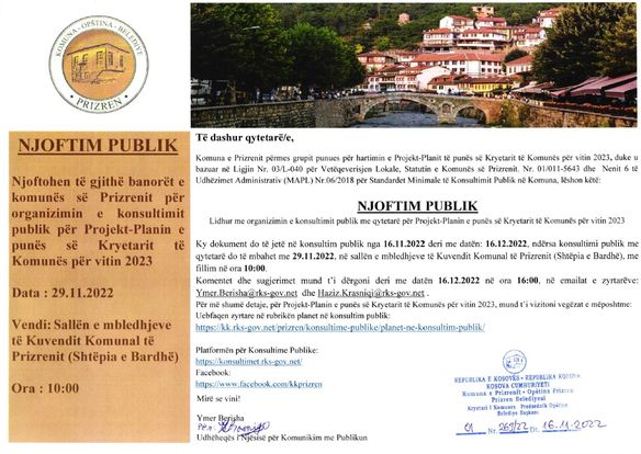 Komuna e Prizrenit në faqen e saj zyrtare ka njoftuar lidhur me organizimin e konsultimit publik me qytetarë për Projekt-Planin e punës së Kryetarit të Komunës së Prizrenit për vitin 2023: Ky konsultim publik me qytetar do të mbahet me 29 nëntor duke filluar nga ora 10:00.