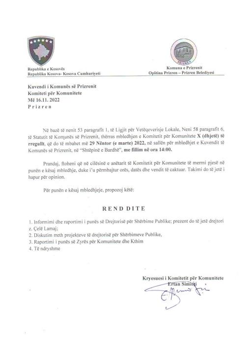 Me 29 nëntor mbahet mbledhja e dhjetë e rregullt e Komitetit për Komunitete