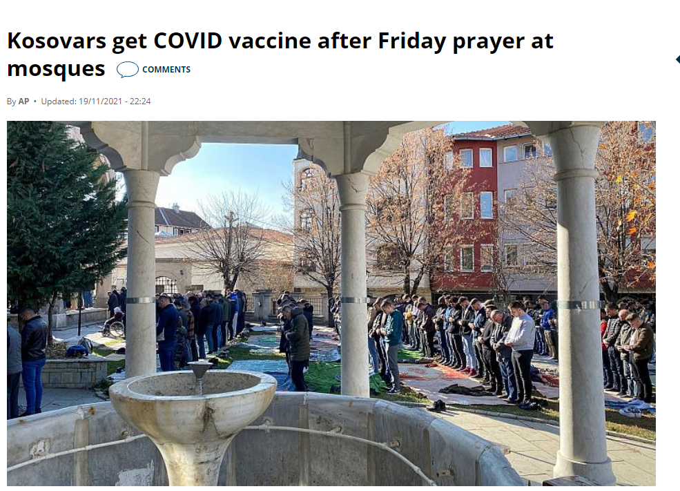 “Kosovarët marrin vaksinën kundër COVID-19 pas namazit të xhumasë në xhami”, ishte titulli që mbizotëronte te artikulli i agjencisë amerikane të lajmeve, AP News, dhe po ashtu edhe te mediumet e tjera të lartë cekura.