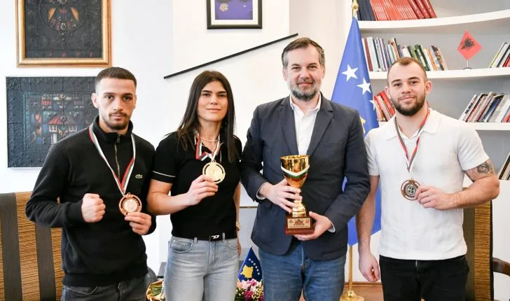 Pas prezantimit të denjë të Kosovës në turneun prestigjioz “Strandja” në Sofje, Ministri Hajrulla Çeku ka pritur në takim boksieren Donjeta Sadiku e cila ka fituar medalje të artë, si dhe Loris Idrizi dhe Bashkim Bajoku, të cilët fituan medalje të bronzta.