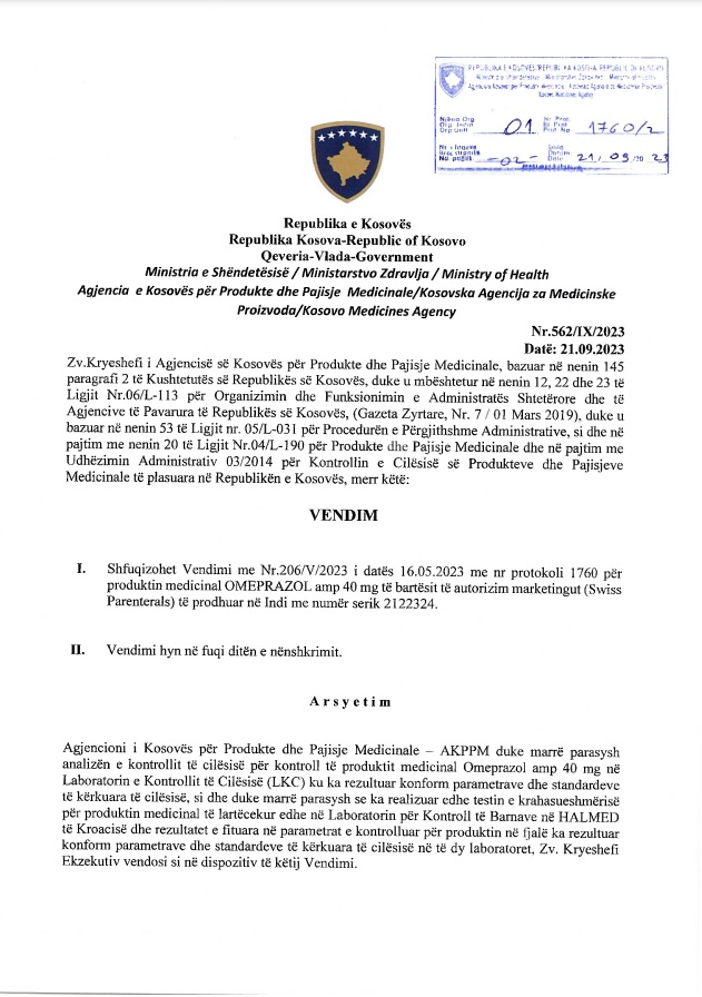 “Prandaj, shfuqizohet Vendimi i AKPPM-së i datës 16.05.2023 me numër protokolli 1760 për produktin Omeprazol për injeksion 40 mg, me numër serik 2122324”, thuhet tutje.