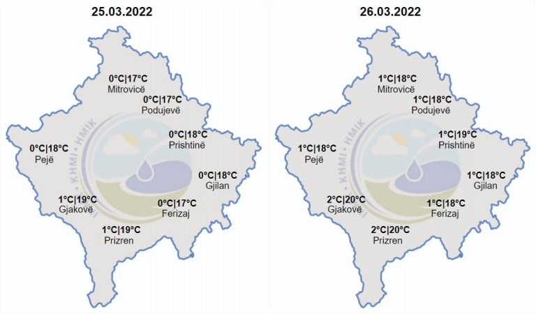 Minimalet do të lëvizin ndërmjet 0-1 gradë Celsius, ndërsa maksimalet e ditës parashihen të lëvizin ndërmjet 17-20 gradë Celsius. Do të fryjë erë nga drejtimi i verilindjes, e lehtë deri mesatare.