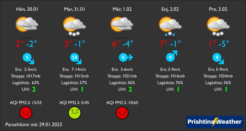 Sipas Prishtina Weather gjatë ditës së sotme pritet të mbajë kryesisht mot me vranësira dhe kohë pas kohe mundësi për reshje lokale të dobëta bore.