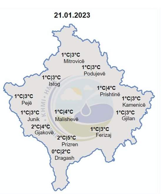 Temperaturat minimale do të lëvizin ndërmjet 0-2 gradë Celsius, ndërsa maksimalet e ditës parashihen të lëvizin ndërmjet 2-5gradë Celsius, thuhet në njoftimin e IHMK-së.