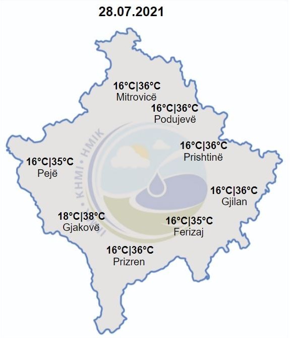 Nëpër disa zona parashihen vranësira, kryesisht rreth relievit malor, ku parashihet edhe ndonjë rigë e dobët. Temperaturat minimale do të lëvizin ndërmjet 16-18 gradë Celsius, ndërsa maksimalet e ditës parashihen të lëvizin ndërmjet 35-38 gradë Celsius. Indeksi UV mbetet në vlera ekstreme, prandaj kujdes nga kontakti direkt me rrezet e diellit, sidomos personat në moshë dhe shtresa tjetër e popullatës me sëmundje kronike.