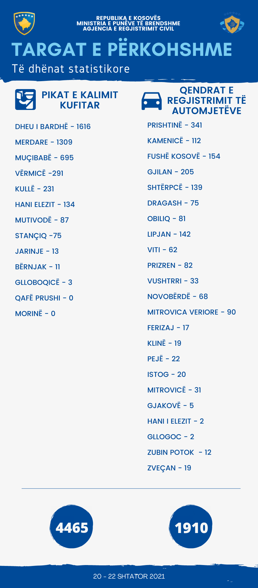 “Gjatë periudhës 20 – 22 Shtator 2021, Ministria e Punëve të Brendshme (MPB), respektivisht Agjencia për Regjistrim Civil (ARC), ka administruar gjithsej 6375 targa të përkohshme në të gjitha Pikat e Kalimit Kufitar (PPK) dhe Qendrat e Regjistrimit të Automjeteve në mbarë territorin e Republikës së Kosovës. “, thuhet në njoftimin e MPB-së.