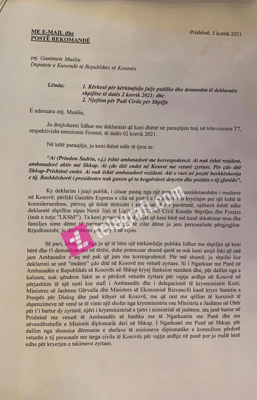 “Para disa ditësh në postën time në Kuvend më kishte ardhur një zarf, ku shkruhej se ishte dërguar nga presidentja Vjosa Osmani. Pasi e hapa për çudi brenda nuk ishte shkresa nga presidentja, por një letër e pa nënshkruar e Prindon Sadriut. Letra që ma kishte dërguar me emër të presidentes përmbante një kërcënim për padi civile. Arsyeja e përmendur ishte se unë në një prej televizioneve pasna deklaruar se ai ishte ambasador me korrespodencë dhe se nuk rrinte në Shkup dhe udhëton çdo ditë dhe se atë ambasador e bëri bashkëshortja e tij”, ka thënë Musliu.