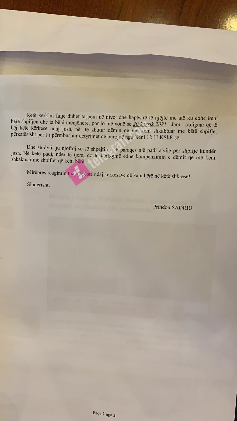 Ajo ka shtuar se në letrën që Sadriu i kishte dërguar i kishte caktuar edhe afatet se kur do t’i kërkoj falje.