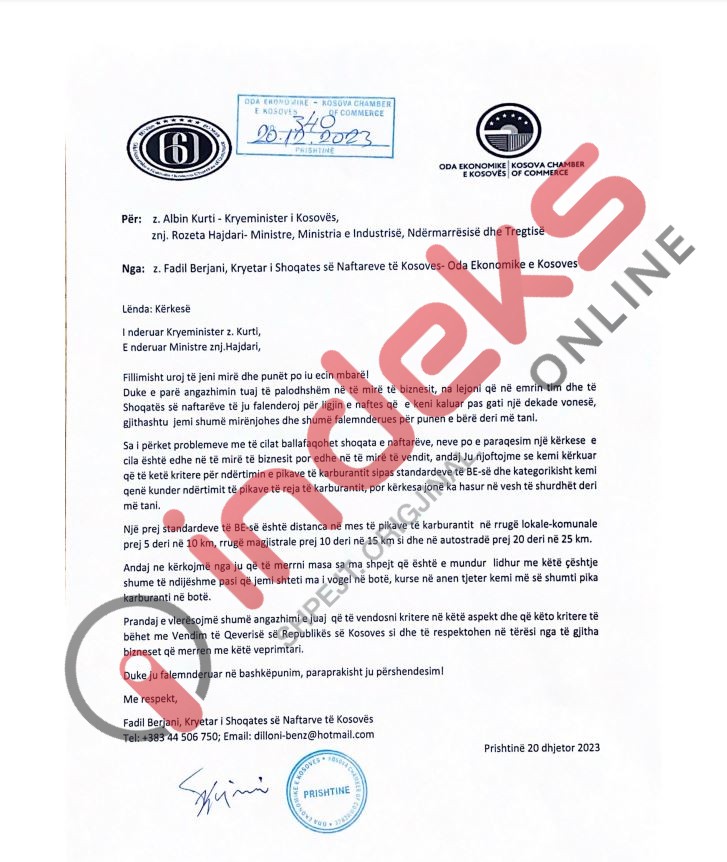 Në letrën e dërguar kryeministrit të njëjtit kanë kërkuar që distanca mes karburanteve të jetë sipas standarteve të BE-së, në rrugë komunale prej 5 deri në 10 kilometra në rrugë magjistrale prej 10 deri 15 km dhe në autostradë prej 20-25 km.