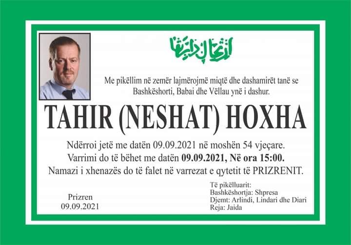 Ka ndërruar jetë në moshën 54 vjeçare, profesori i Informatikës dhe Inovacionit, Tahir Hoxha. Ai ishte ndër njohësit e parë të teknologjisë informative në Prizren, në vitet ’80-ta. Lajmin për vdekjen e tij e ka bërë publik familja përmes një përkujtimi mortor në rrjete sociale. Profesori i ndjerë, Tahir Hoxha, qysh në fillim të moshës së re ka shprehur interesim për lëmin e kibernetikës, duke ndjekur kursin e parë të hapur në Prizren për këtë fushë. Pas përfundimit të kursit, ai vijon që të mbajë kurse për kibernetikë për të rinjtë tjerë prizrenas që nga vitet e 80-ta deri në fillimin e luftës në Kosovë.