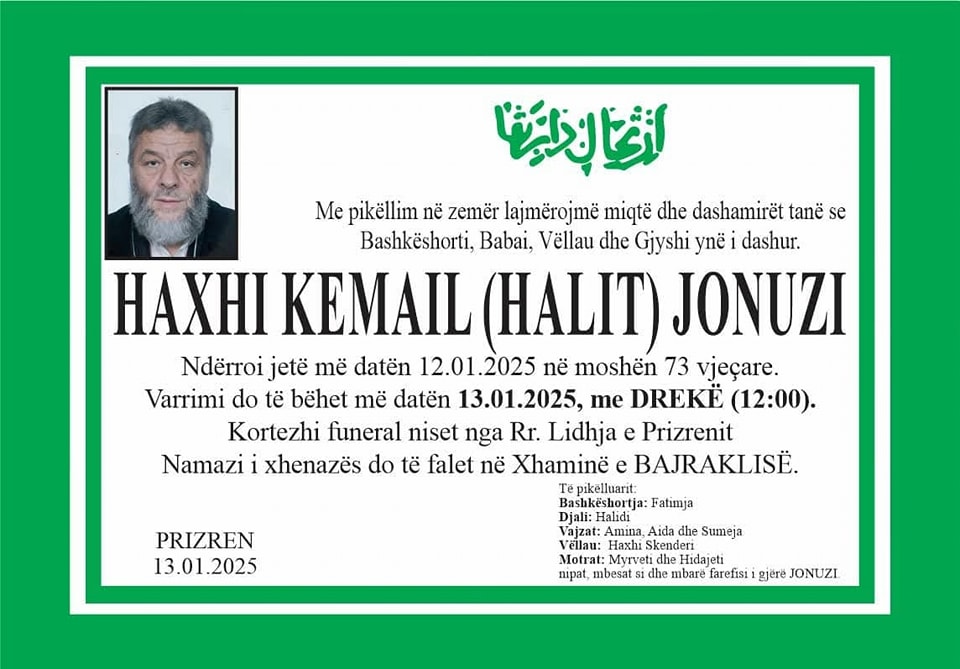 Ka ndërruar jetë në moshën 73 vjçare afaristi dhe humansiti nga Prizreni, Haxhi Kemajl (Halit) Jonuzi.