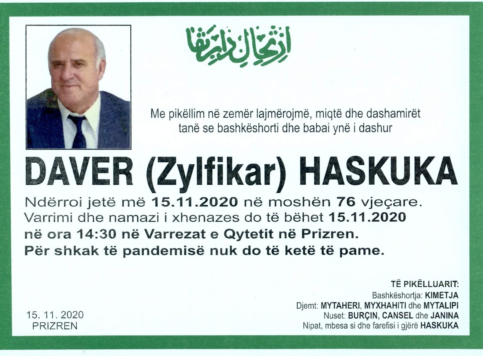 Në moshën 76 vjeçare ka ndërruar jetë, Daver Haskuka, babai i kryetarit të komunës së Prizrenit.