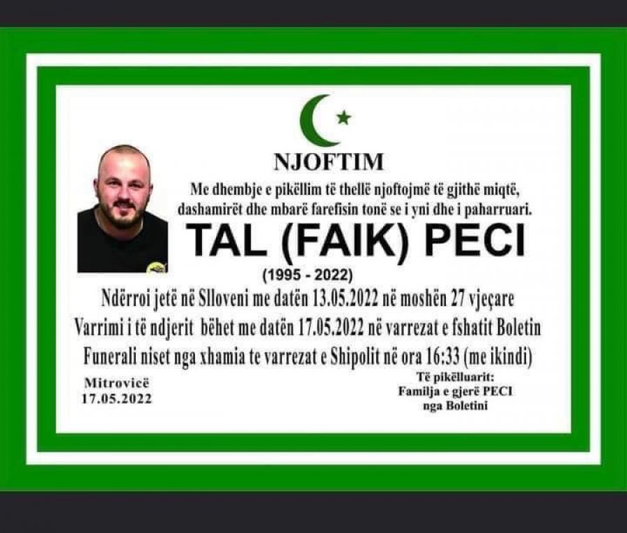 Familjarët kanë njoftuar sot se 27-vjeçari Tal Peci ka vdekur në Slloveni më 13 maj, ndërsa varrimi i tij do të bëhet sot, në fshatin Boletin të Mitrovicës.