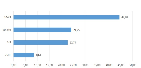 Ndërsa, përqindja më e madhe e investimeve në vend nga ndërmarrjet e vogla (10 – 49 punëtorë) me 44,4%, ndërmarrjet e mesme (50 – 249 punëtorë) me 24,3%, dhe mini-ndërmarrjet (1-9 punëtorë) me 22,7%.