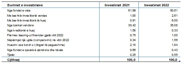 Sa i përket burimit të investimeve, rreth 50,6% e vlerës së investimeve të ndërmarrjeve ishte realizuar nga fondet e veta dhe 35,1% nga bankat vendore. Ndërkaq, burimet e tjera zënë një peshë më të vogël në kuadrin e burimeve totale për investime.