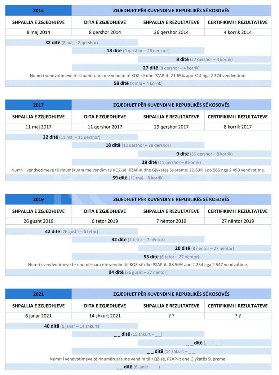 Ndërkaq derisa në zgjedhjet e vitit 2014 KQZ-së i janë dashur 27 ditë nga dita e mbajtjes së zgjedhjeve e deri në certifikimin e rezultateve, në zgjedhjet e vitit 2017 kanë kaluar gjithsej 28 ditë nga dita e zgjedhjeve e deri në certifikimin e rezultateve.