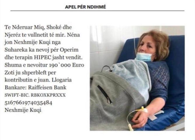Nexhmije Kuqi nga fshati Shirokë i Suharekës, ka nevojë për ndihmën tuaj, pasi vuan nga një sëmundje e rëndë dhe shuma që nevojitet për operimin e saj dhe terapinë HIPEC, është 190.000 euro.